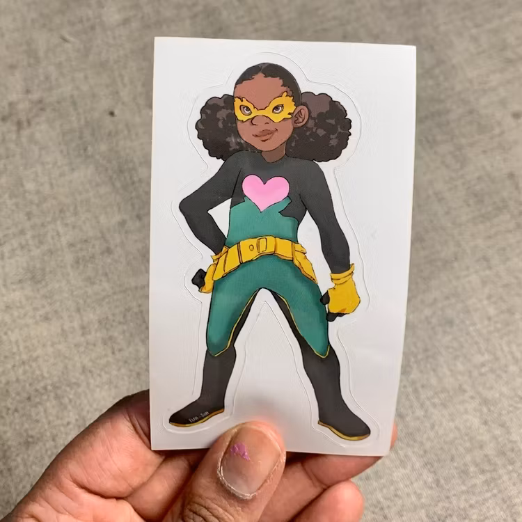 1 stort klistermärken av superhjälten Alma som kan skapa liv, få växter och djur att växa och åldras.